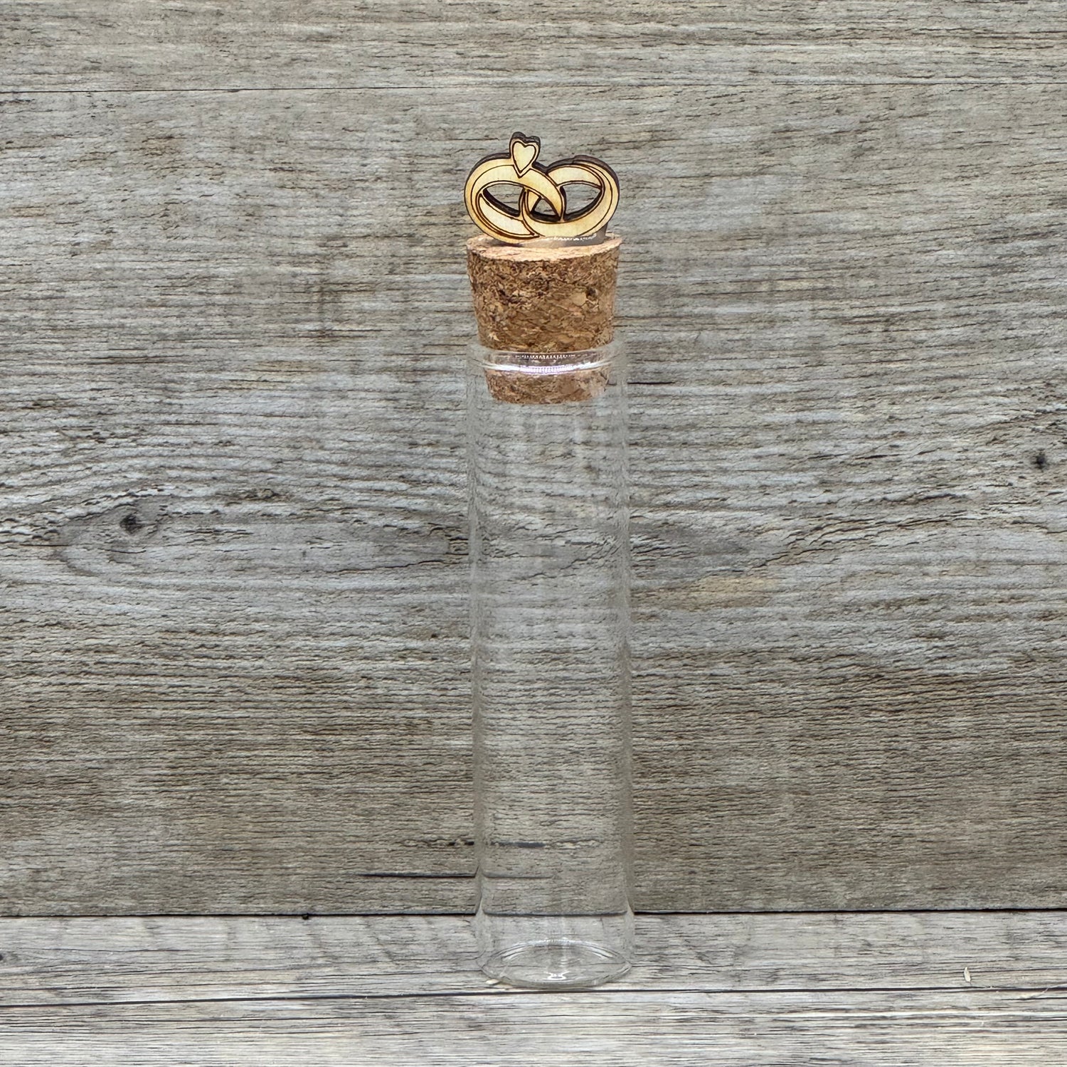 Auf dem Korken befindet sich ein Paar stilvoll gelaserter Trauringe aus Pappelholz – ein feines Detail, das das Hochzeitsmotiv harmonisch abrundet.