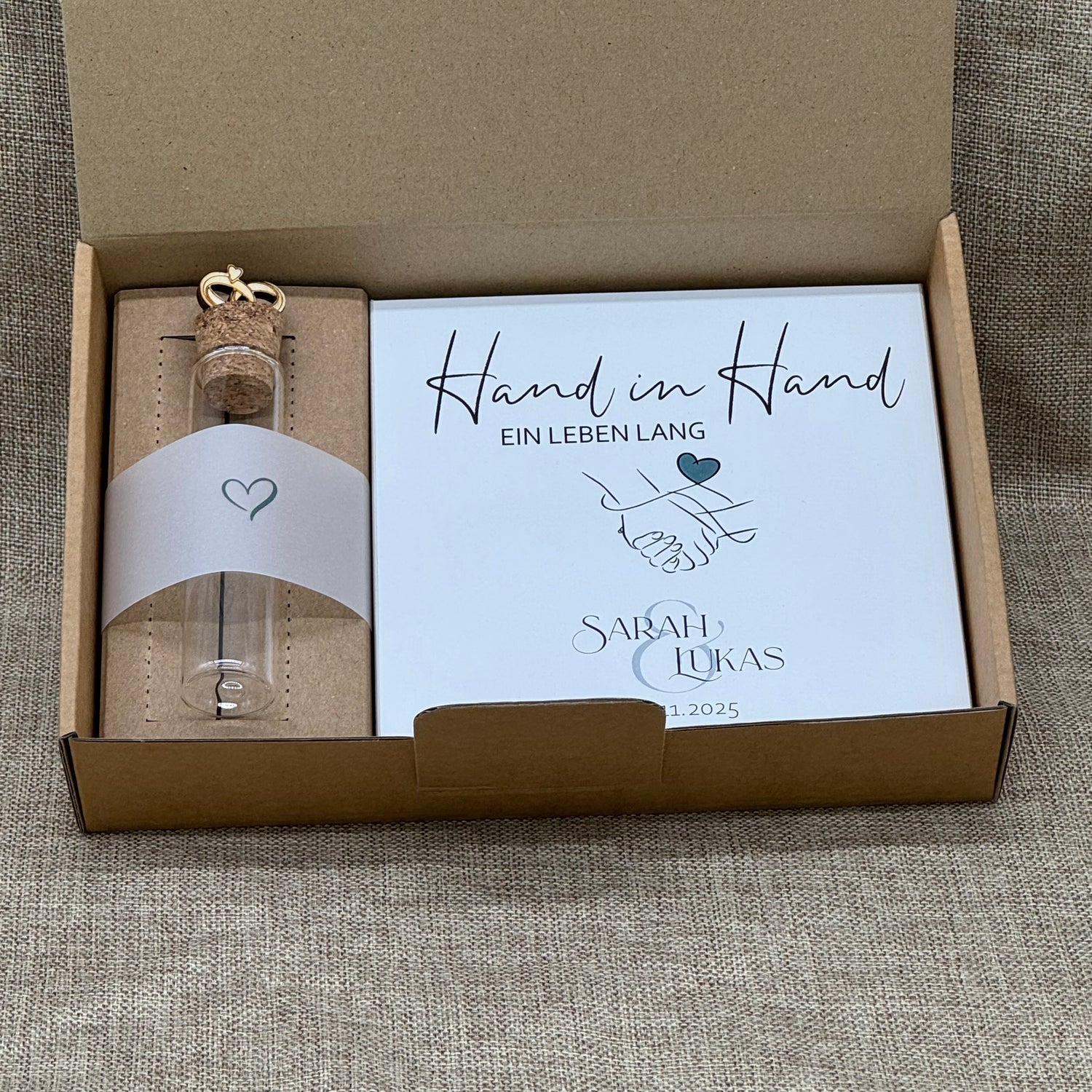 Dieses liebevoll gestaltete Geschenkset zur Hochzeit ist eine besondere Erinnerung für das Brautpaar – perfekt geeignet für Geldgeschenke, Gutscheine oder kleine Botschaften. Das Set besteht aus einem dekorativen Holzblock und einem Reagenzglas mit edlen Details, verpackt in einer stilvollen Geschenkbox.