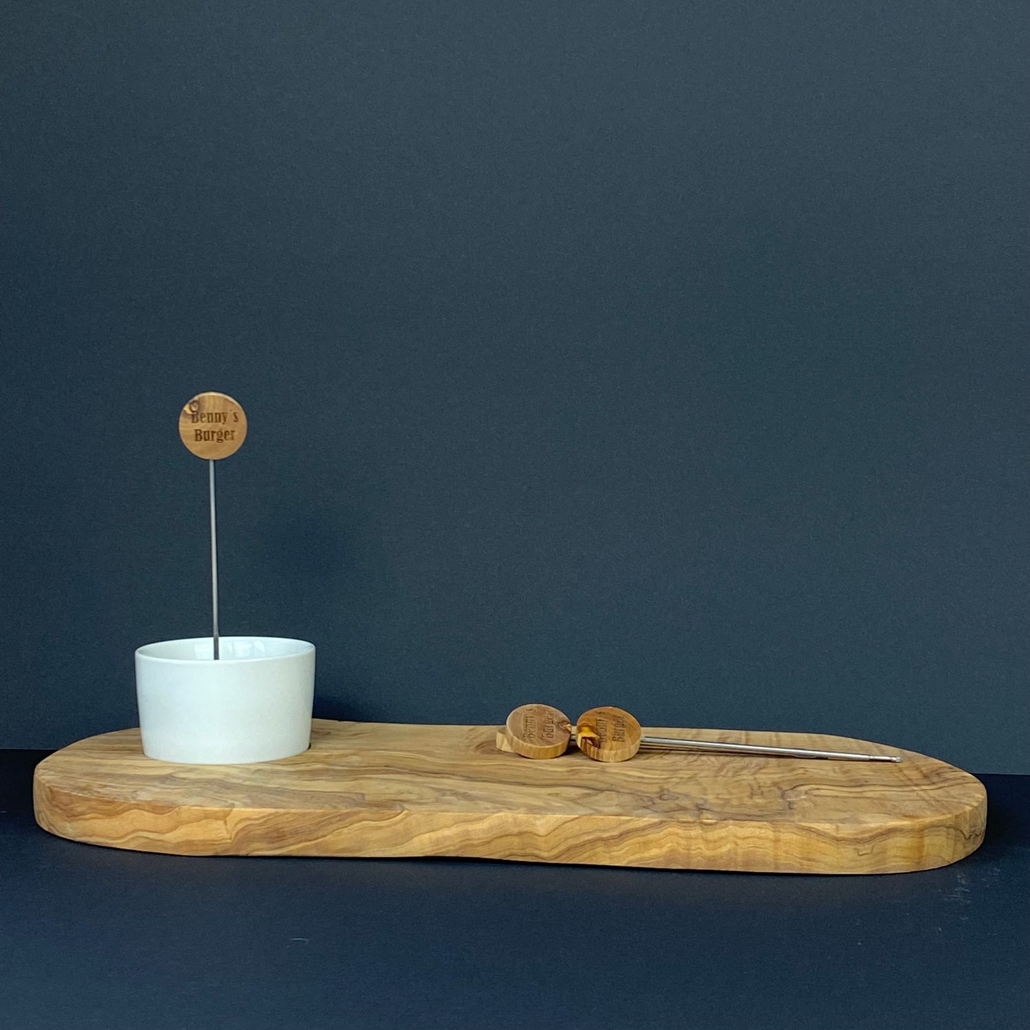 4er Set personalisierbare Burgerspieße aus Olivenholz