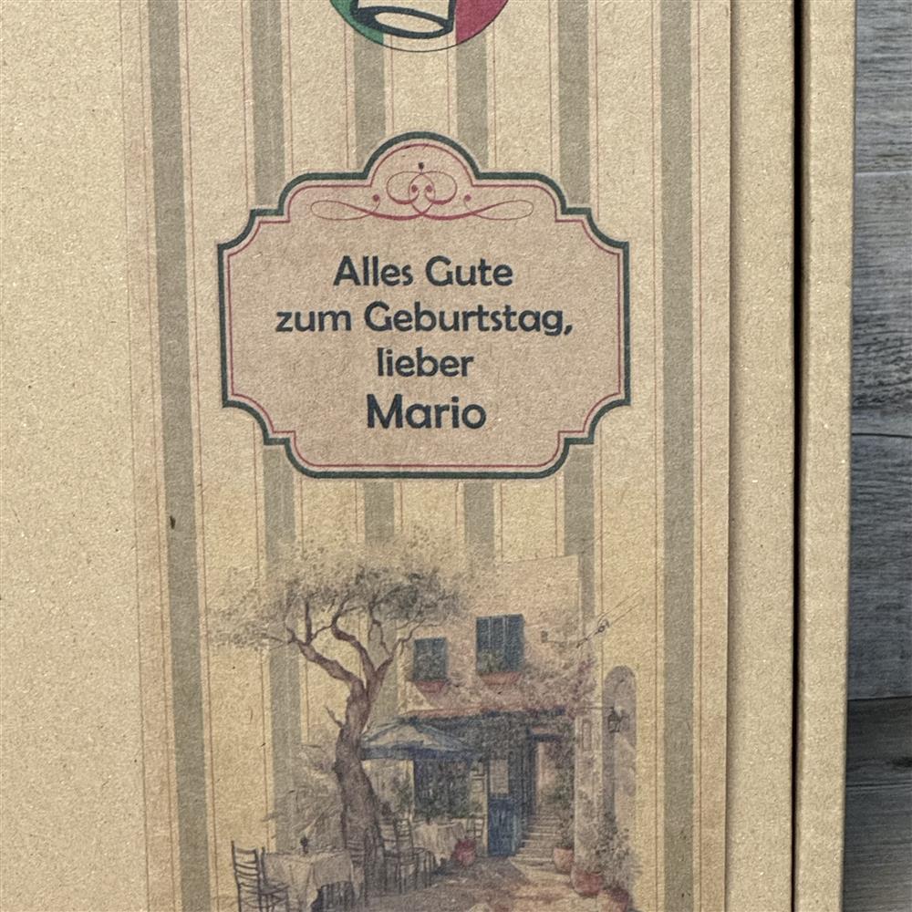 Aufdruck auf der Banderole: "Für eine genussvolle Mahlzeit nach italienischer Art". Auf Wunsch können wir die Banderrole individuell bedrucken. So hast die Möglichkeit ein individuelles und einzigartiges Geschenk zu überreichen.