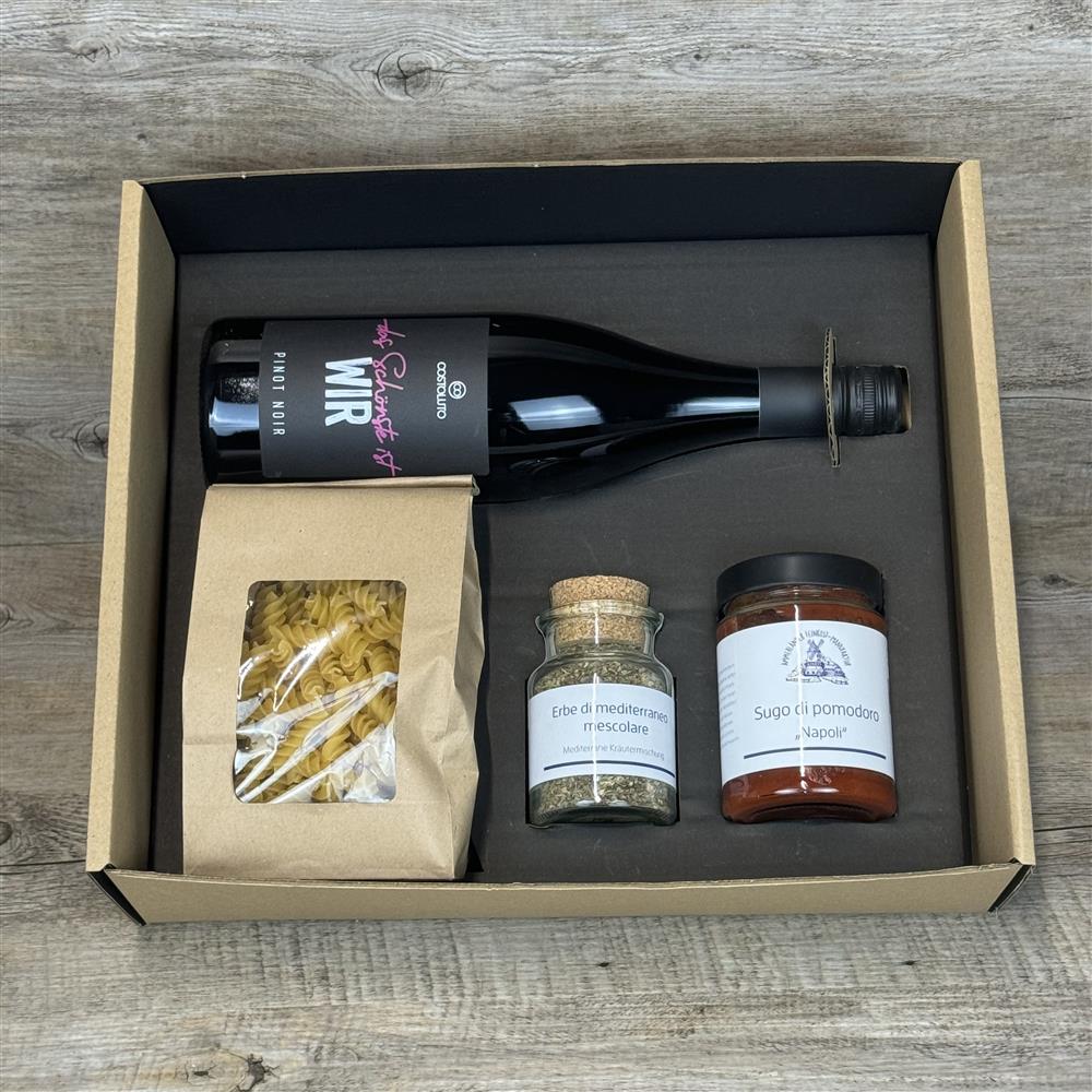 Im Paket enthalten sind Nudeln, eine italienische Tomatensauce, mediterrane Kräuter und ein Flasche Rotwein. Auf der Rotweinflasche ist ein Etikett mit dem Schriftzug " Das Schönst ist Wir" angebracht. Verschenke eine genussvolle Mahlzeit mit diesen hochwertigen Zutaten. Dieses Geschenkpaket beistert auch durch seine schöne Geschenkverpackung mit der Schmuck Banderrole. Die liebevoll gestaltete Banderole macht Lust auf Italien.