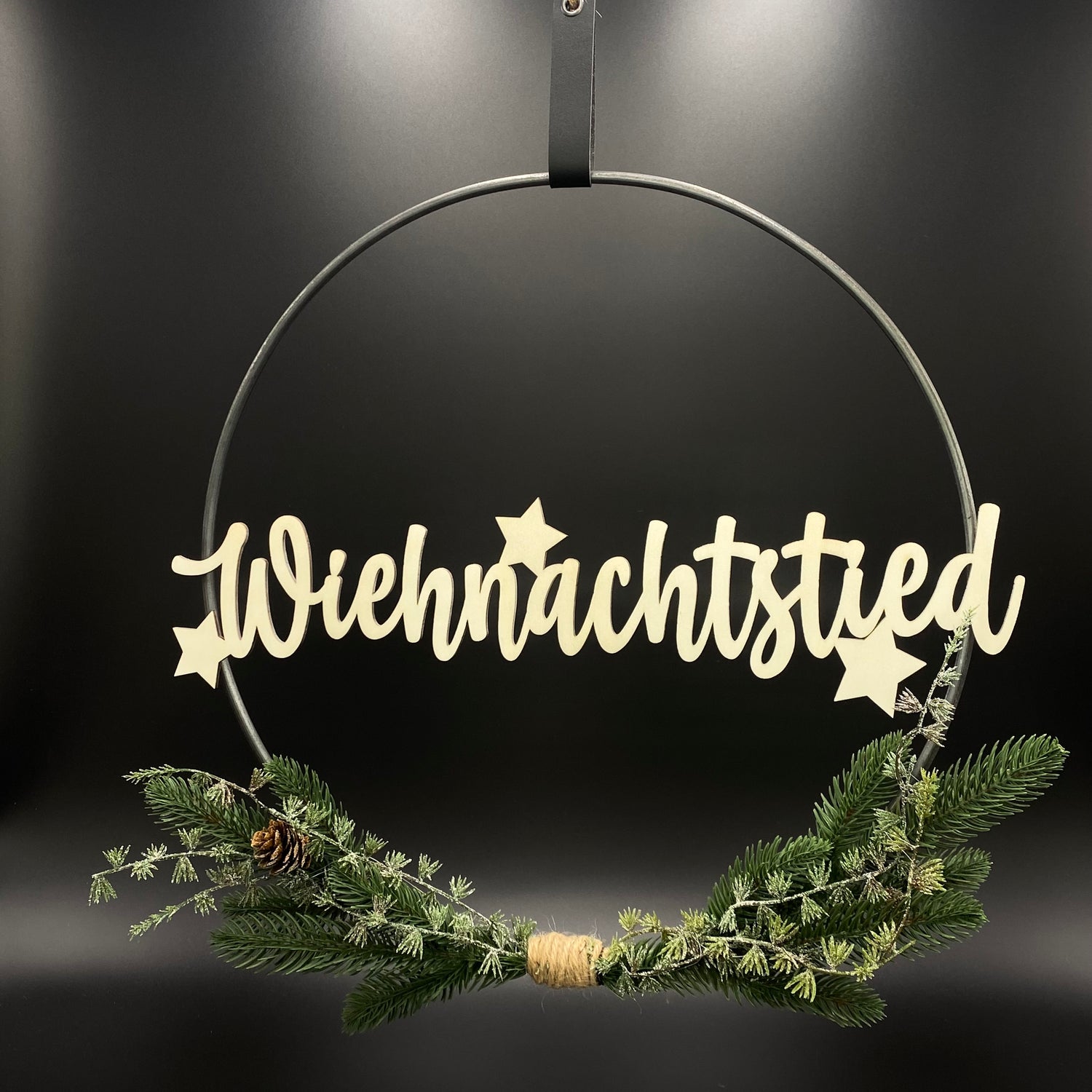 Der Clou: Wählen Sie Ihren persönlichen Schriftzug! Jeder Schriftzug aus Pappelholz wird mit zwei Magneten am Kranz befestigt und kann jederzeit nach Belieben ausgetauscht werden – für maximale Individualität.