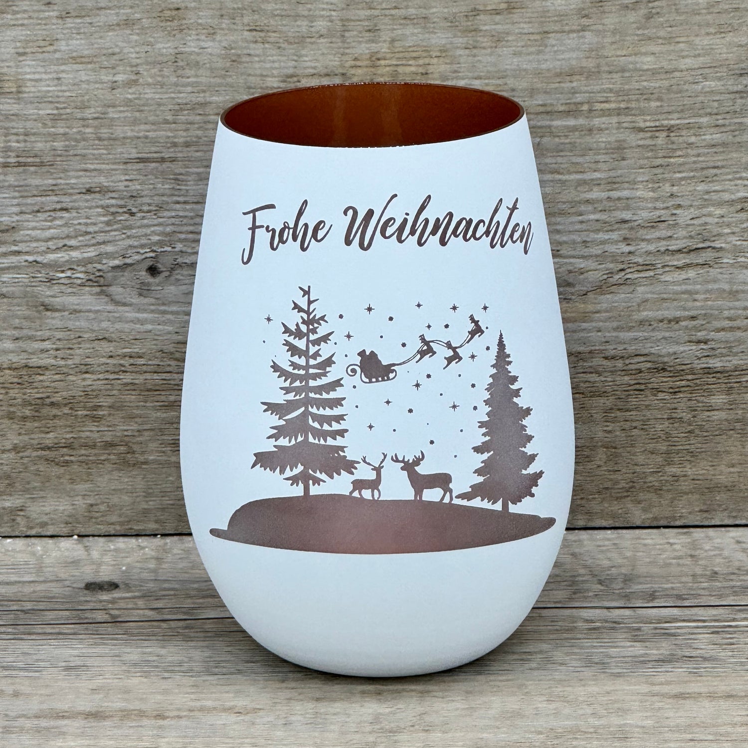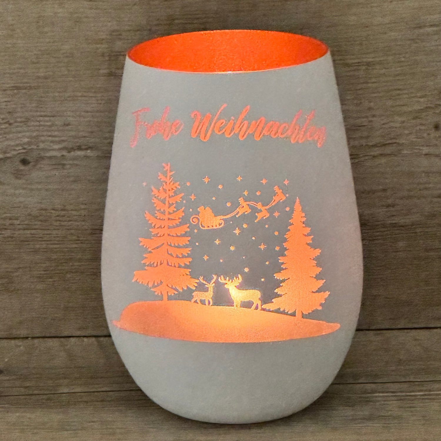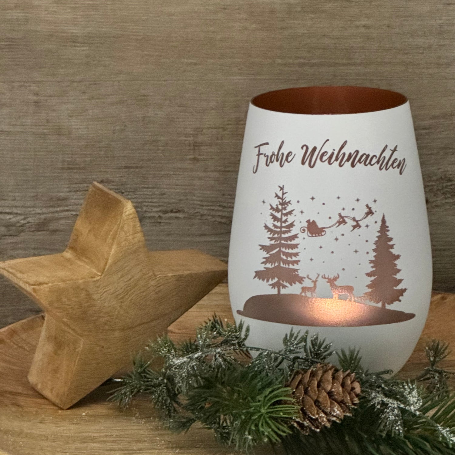 Stelle ein Teelicht hinein und genieße den sanften Kerzenschein, der eine warme und einladende Atmosphäre schafft. Mit seiner eleganten Gravur ist es das perfekte Geschenk für Freunde und Familie, um die Freude der Weihnachtszeit zu teilen.